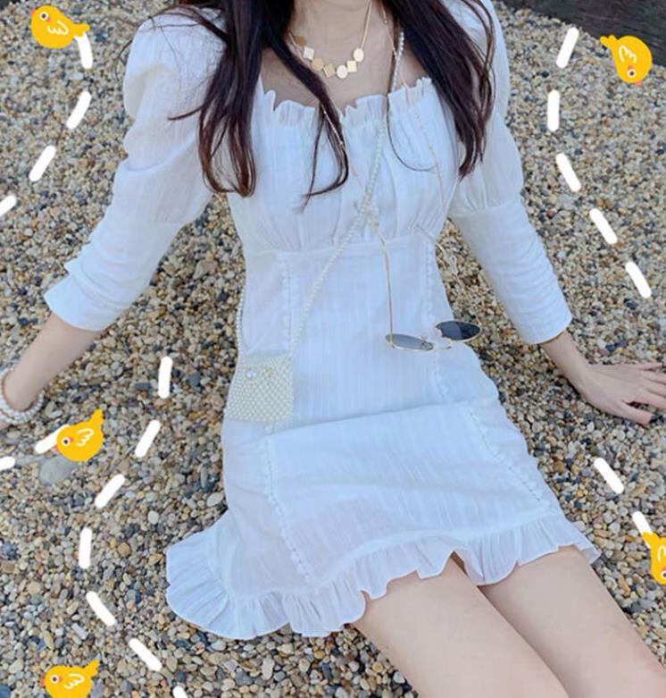 2022春夏新作 女 レディース ハイウエスト 半袖 白 ミニ ワンピース ドレス 台型スカート XS-XL 704136-Icy-749