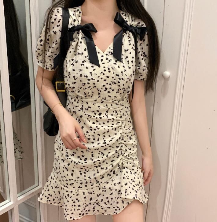 2022春夏新作 女 レディース ハイウエスト 半袖 花柄 ミニ ワンピース ドレス 台型スカート S-2XL 704136-Icy-750