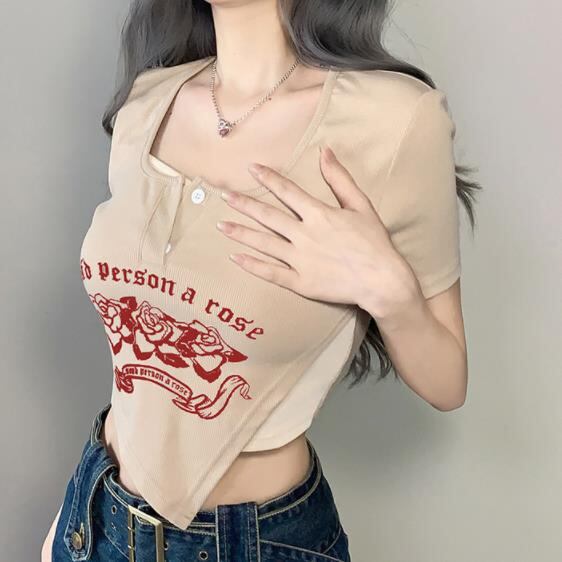 2022春夏新作 レディース 女 半袖 丸首 ニット プリント Tシャツ トップス インナー S-L 704136-KING-2403
