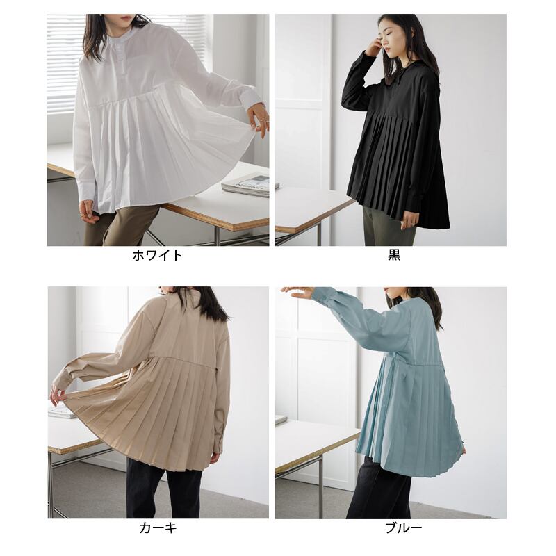 2024新作 トップス プリーツ シャツ バンドカラー シャツ ブラウス 長袖 レディース きれいめ 白 ブルー 528133-tops413
