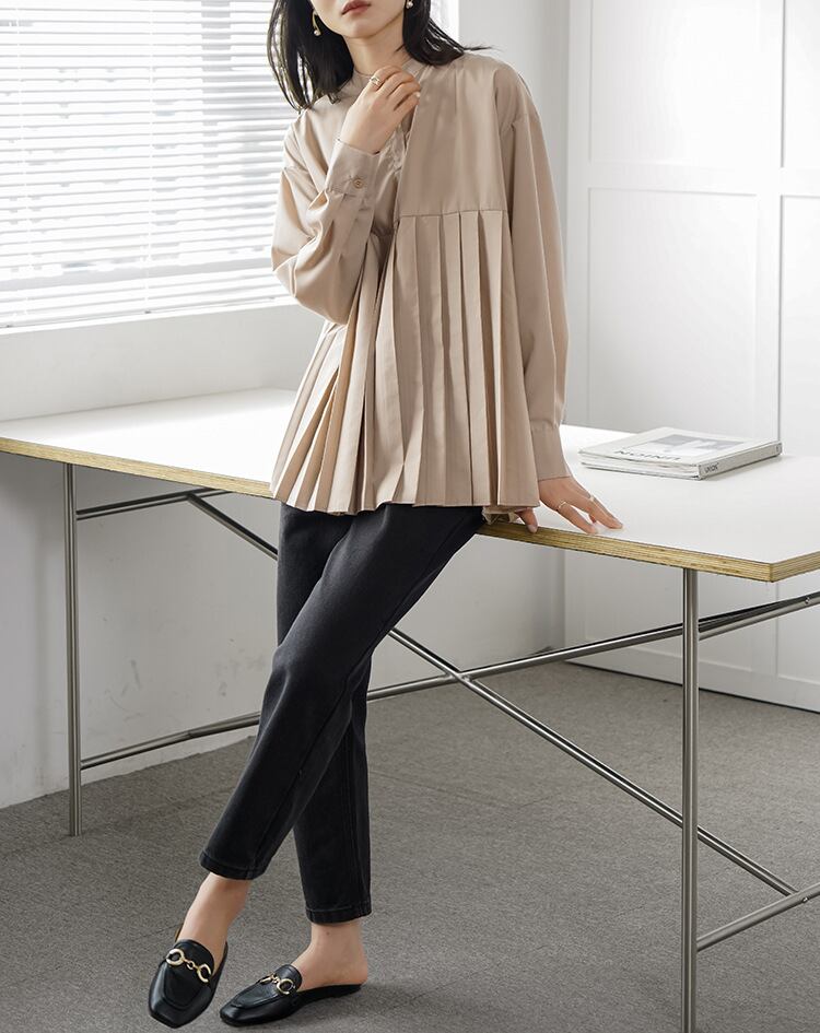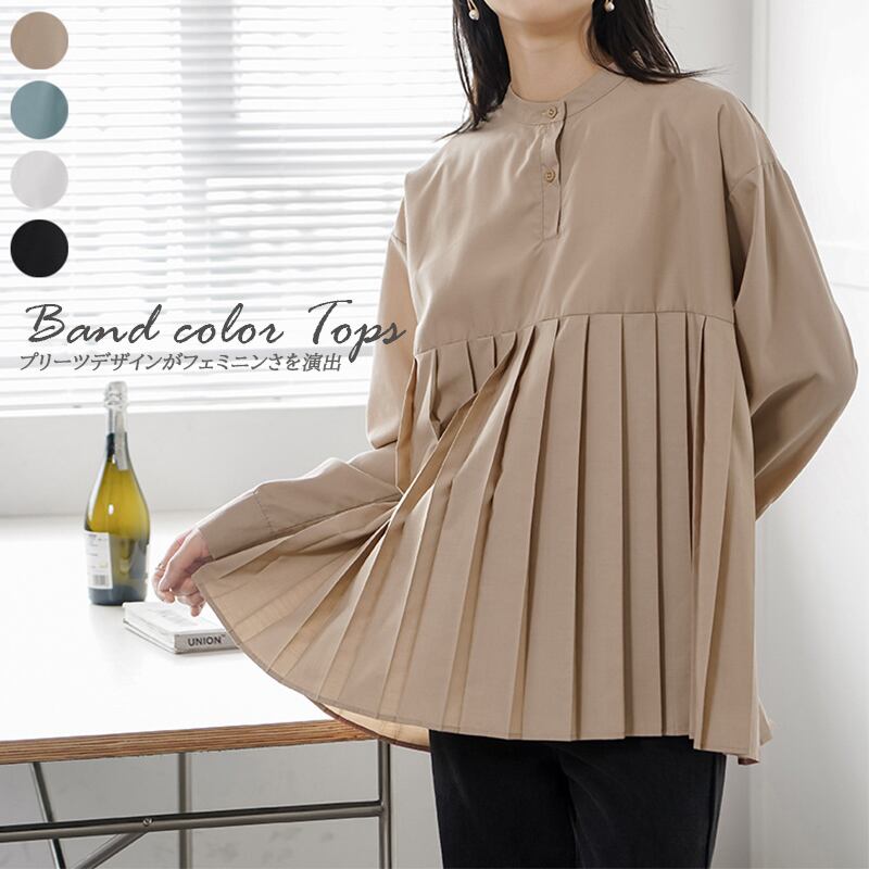 ・プリーツデザインがフェミニンなバンドカラートップス。