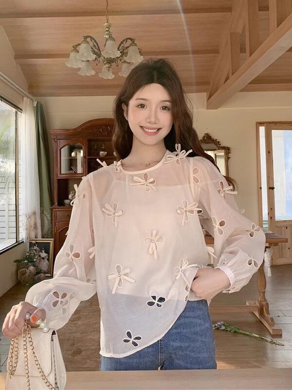トップス シャツ ブラウス 長袖 クルーネック ラウンドネック シースルー レディース 430798-A-a6119