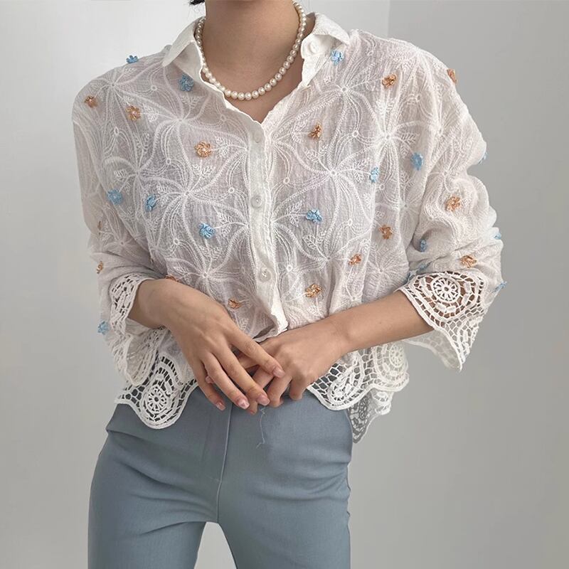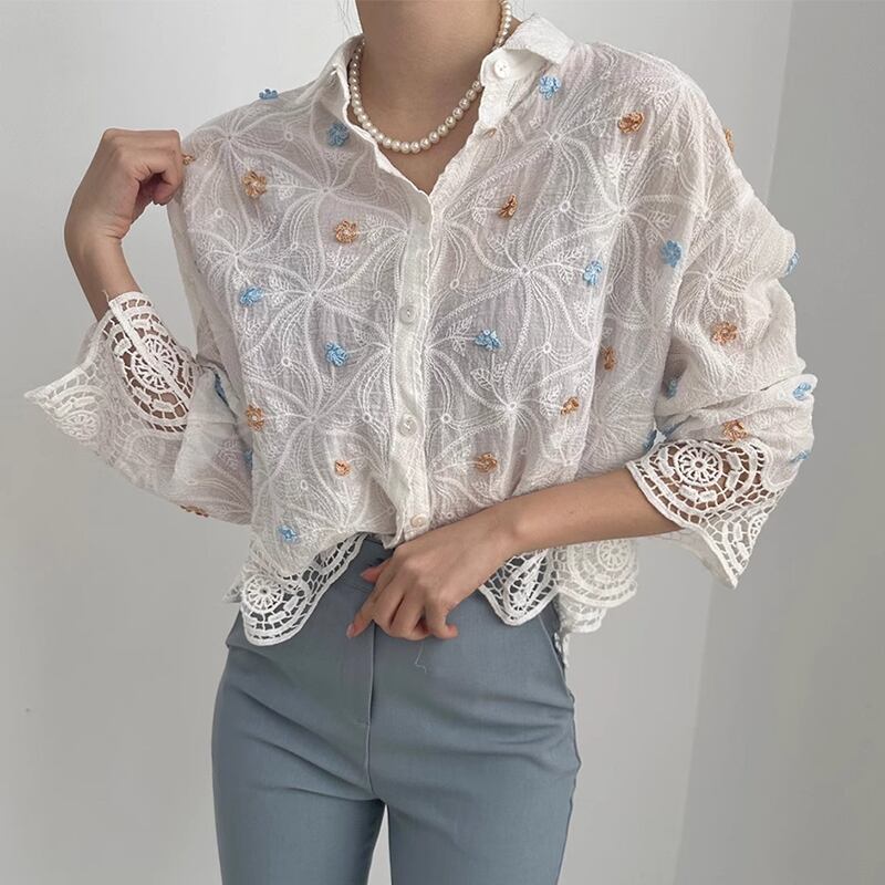 トップス シャツ ブラウス 長袖 レース 民族風 カットアウト レディース 430798-A-a6113