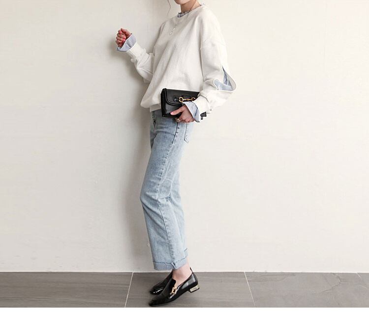 ・シンプルなトレーナー×ストライプシャツの異素材の組み合わせ。